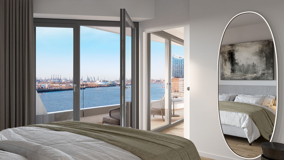 Die Ein- bis Drei-Zimmer-Apartments verfügen über durchdachte Grundrisse sowie eine gehobene Ausstattung mit geschmackvollen Küchen und Einbaumöbeln in Bad oder Garderobe. Die Krönung aber sind die Balkone und Loggien, die zukünftigen Bewohnerinnen und Bewohnern die einzigartige HafenCity-Aussicht bieten.
